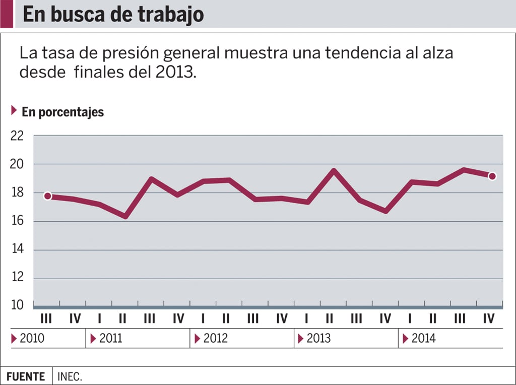 A diciembre del 2014, fueron el desempleo entre las mujeres y la mayor cantidad de hombres con empleo que desean un puesto nuevo los factores que influyeron en la tasa de presión general, comentó Braulio Villegas, investigador del INEC.