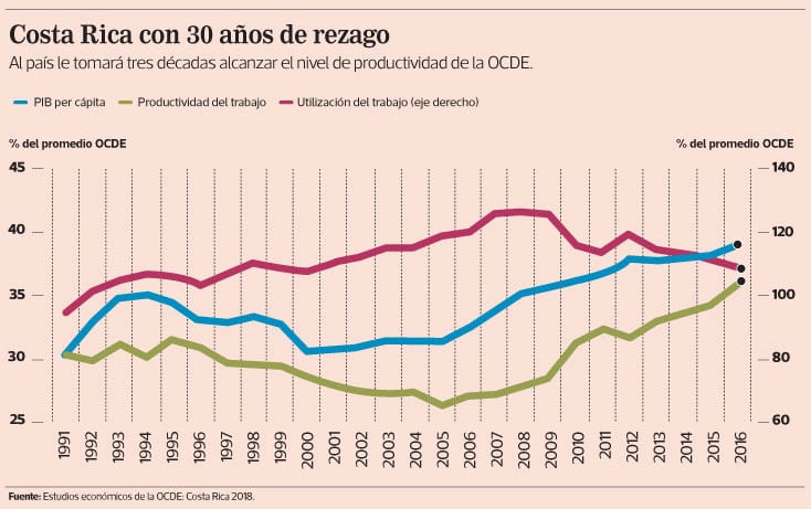 La utilización de la mano de obra en Costa Rica está por encima del promedio de la OCDE, e incluso si el país lograra crecer (crecimiento económico) a su tasa más alta de la última década del 3,7%, le tomaría casi 30 años alcanzar el nivel de productividad laboral promedio de la OCDE en la actualidad.
