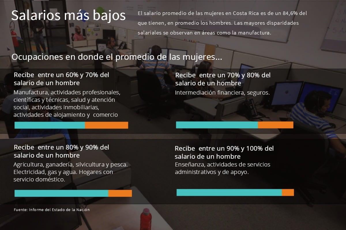 Si trabajan, las mujeres también tienden a recibir salarios más bajos. Según el Informe del Estado de la Nación del 2016, el salario promedio de una mujer en Costa Rica es de un 84,6% del que tienen en promedio los hombres. Sus salarios suelen ser mucho más bajos en áreas como la manufactura o el comercio, donde incluso pueden recibir menos de un tercio de lo que ganan los hombres.