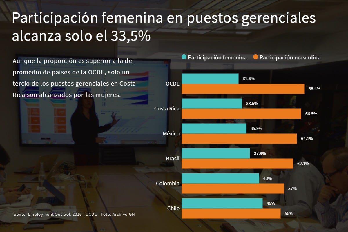 Ascender en puestos laborales también les es más complejo. Según estima la OCDE en un informe del 2016, solo un tercio de los puestos gerenciales en Costa Rica son asumidos por mujeres, frente a una participación masculina en estos cargos de más de un 66%.