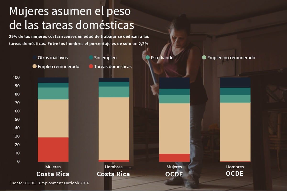 Los resultados de la encuesta de la OIT se suman a un grupo de indicadores preocupantes para la situación femenina en el empleo. En Costa Rica, un tercio de las mujeres en edad de trabajar se dedican exclusivamente a las tareas domésticas. Esa proporción es tres veces más elevada de la que se puede observar en los países desarrollados de la OCDE (Organización para la Cooperación y el Desarrollo Económicos).