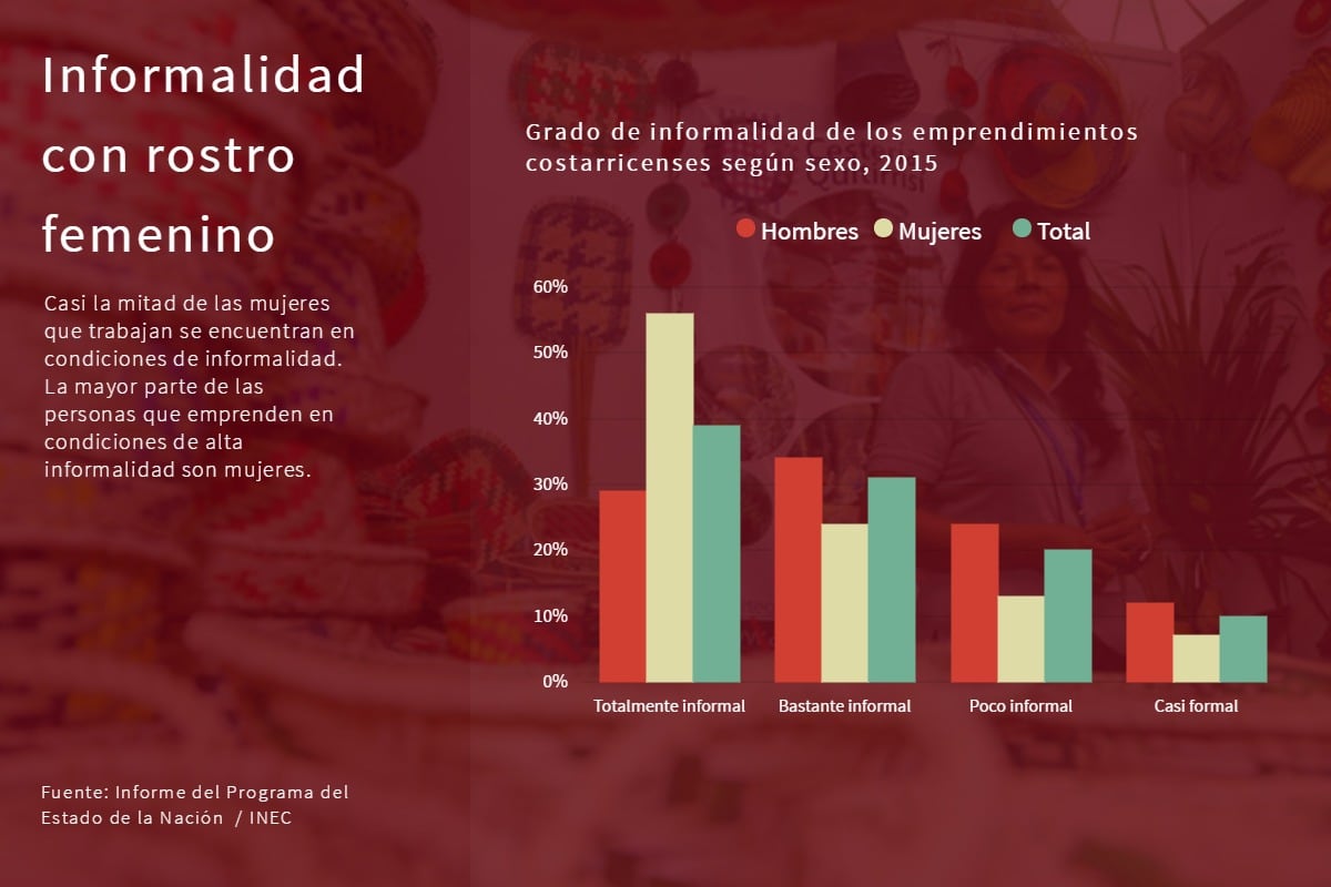La informalidad suele ser más alta para las mujeres y –según el Informe del Estado de la Nación– la gran mayoría de emprendimientos en condiciones de alta informalidad son dirigidos por personas de este género, que enfrentan dificultades de acceso a créditos o recursos para poder sostener sus proyectos.