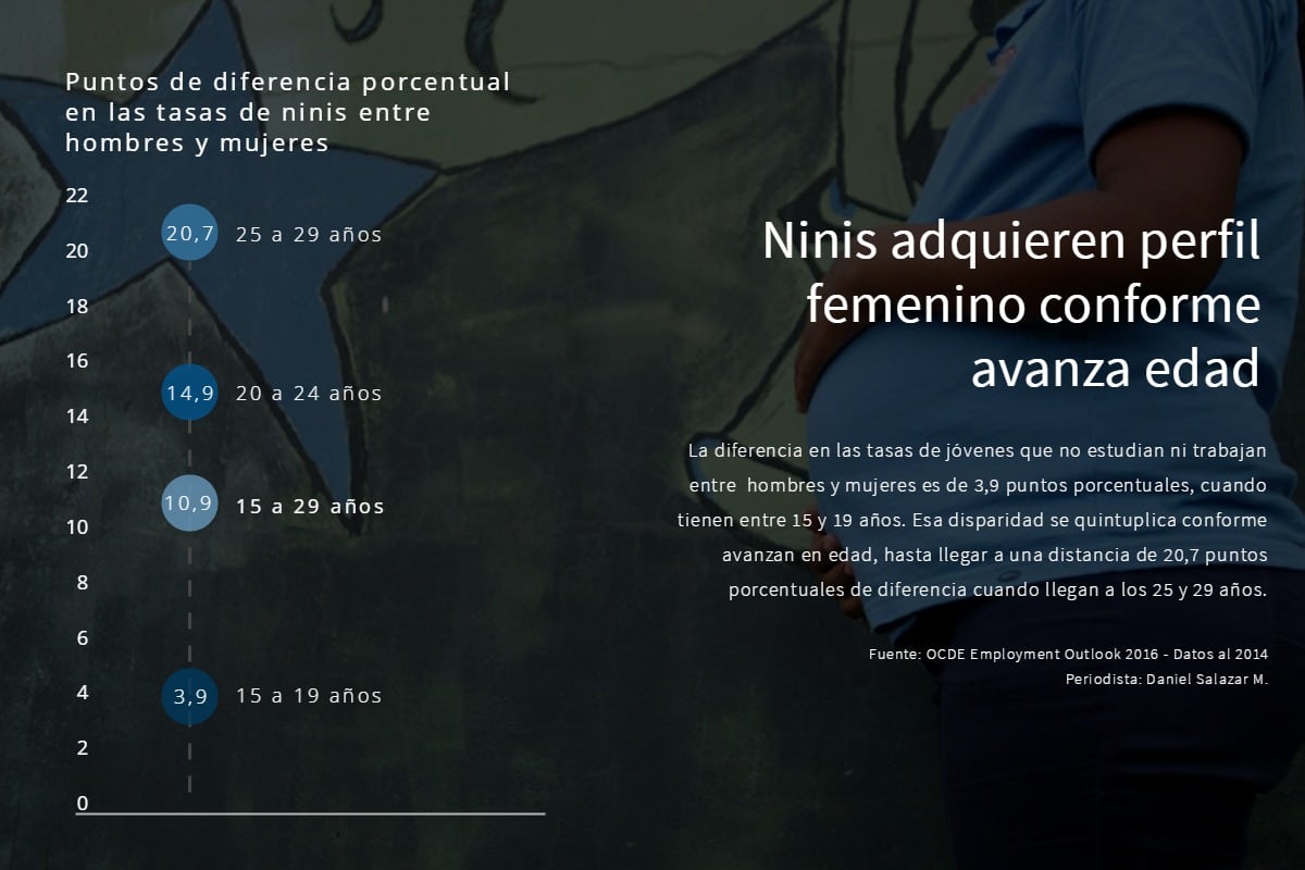 En Costa Rica, la diferencia entre hombres y mujeres para las tasas de “ninis” es de 3,9 puntos porcentuales cuando los jóvenes tienen entre 15 y 19 años. Esa disparidad se quintuplica conforme se avanza en edad, hasta llegar a una distancia de 20,7 puntos porcentuales de diferencia para quienes alcanzan un rango de entre entre 25 y 29 años.