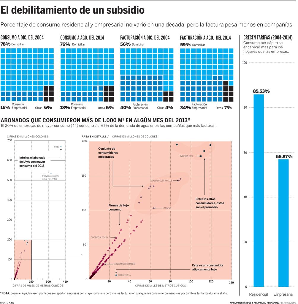Por ejemplo, en agosto del 2004, las empresas pagaban 4,09 veces más entre los 0 y 15 metros cúbicos de consumo de agua. Para agosto del 2014, esa diferencia se encogió a 3,69.