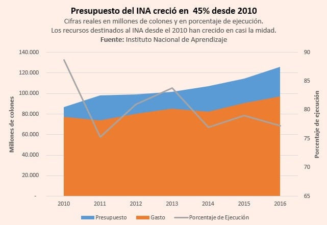 En términos reales, el INA ha visto incrementado su presupuesto en un 45% entre el 2010 hasta el 2016, llegando a requerir para su funcionamiento ¢126.080 millones en el 2016, suma de la que se ejecutó un 77%.