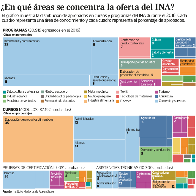 Uno de cada tres graduados (35%) de programas del INA se cualificaron en cursos de informática y comunicación durante el 2016. Esa área concentra programas para aprender sobre el desarrollo de sitios web , producción radiofónica, realización de vídeo, animación digital o similares.