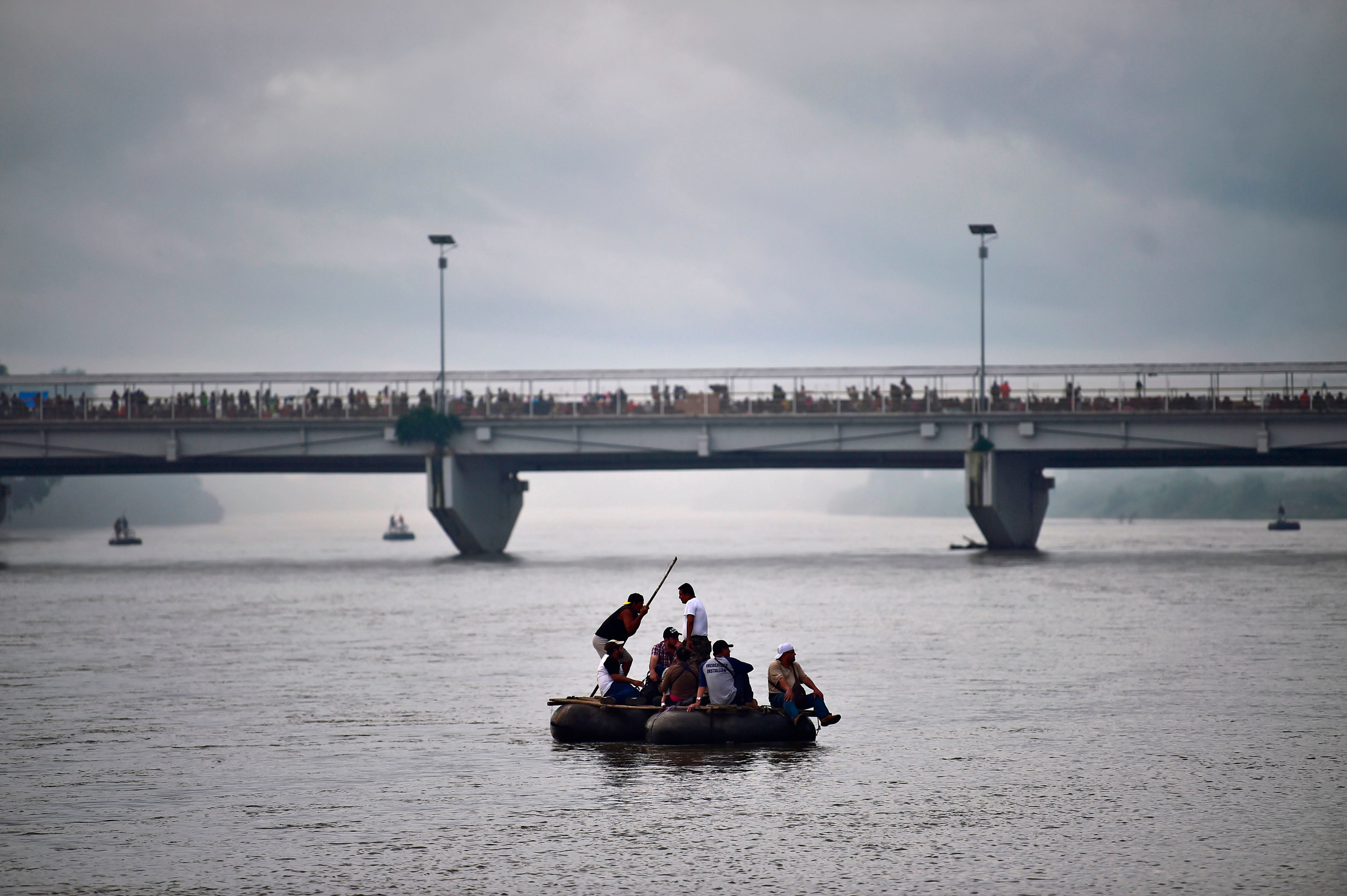 Decenas de niños y bebés ocupan la primera línea de la larga columna de migrantes que abarrotan el puente fronterizo que cruza el caudaloso río Suchiate, al que algunos hombres se lanzaron durante la estampida para tratar de entrar a México.