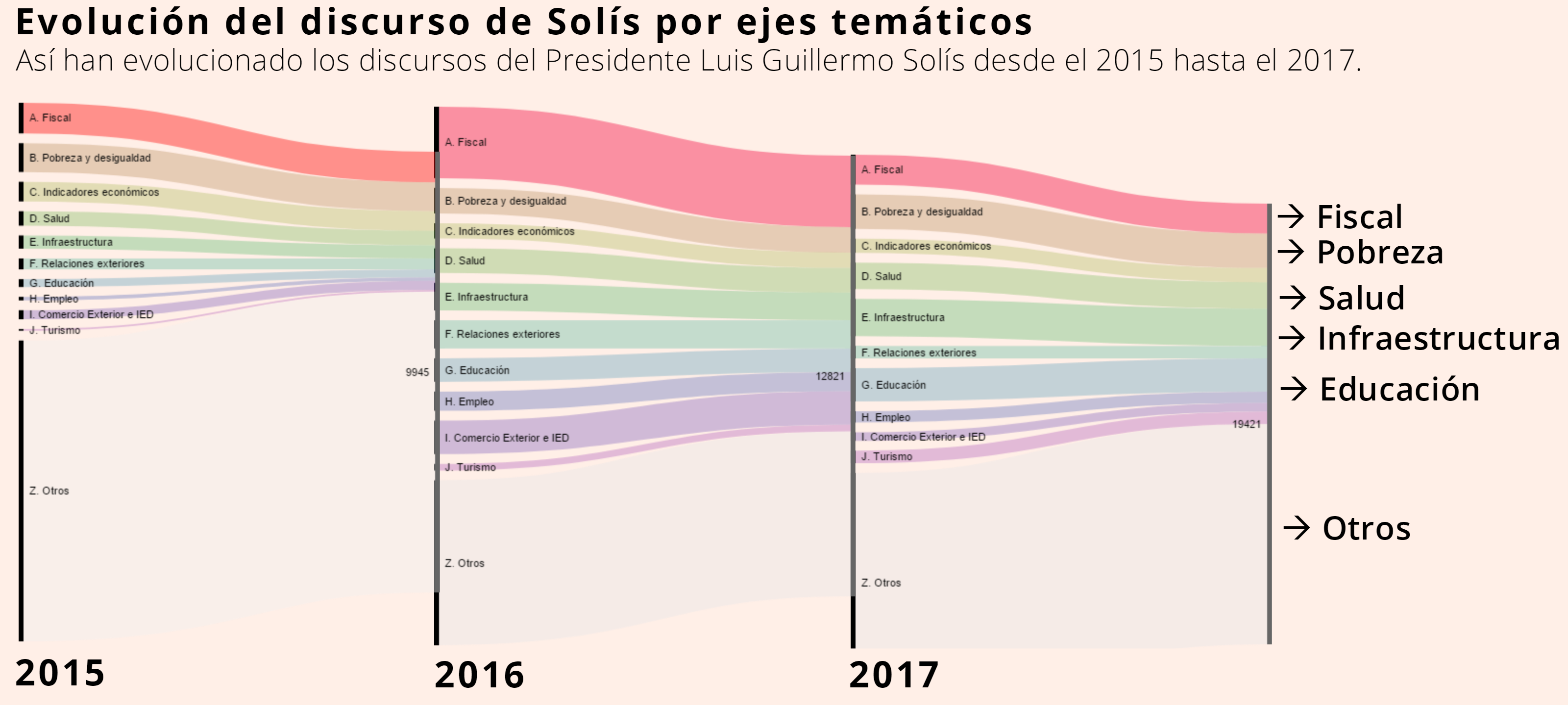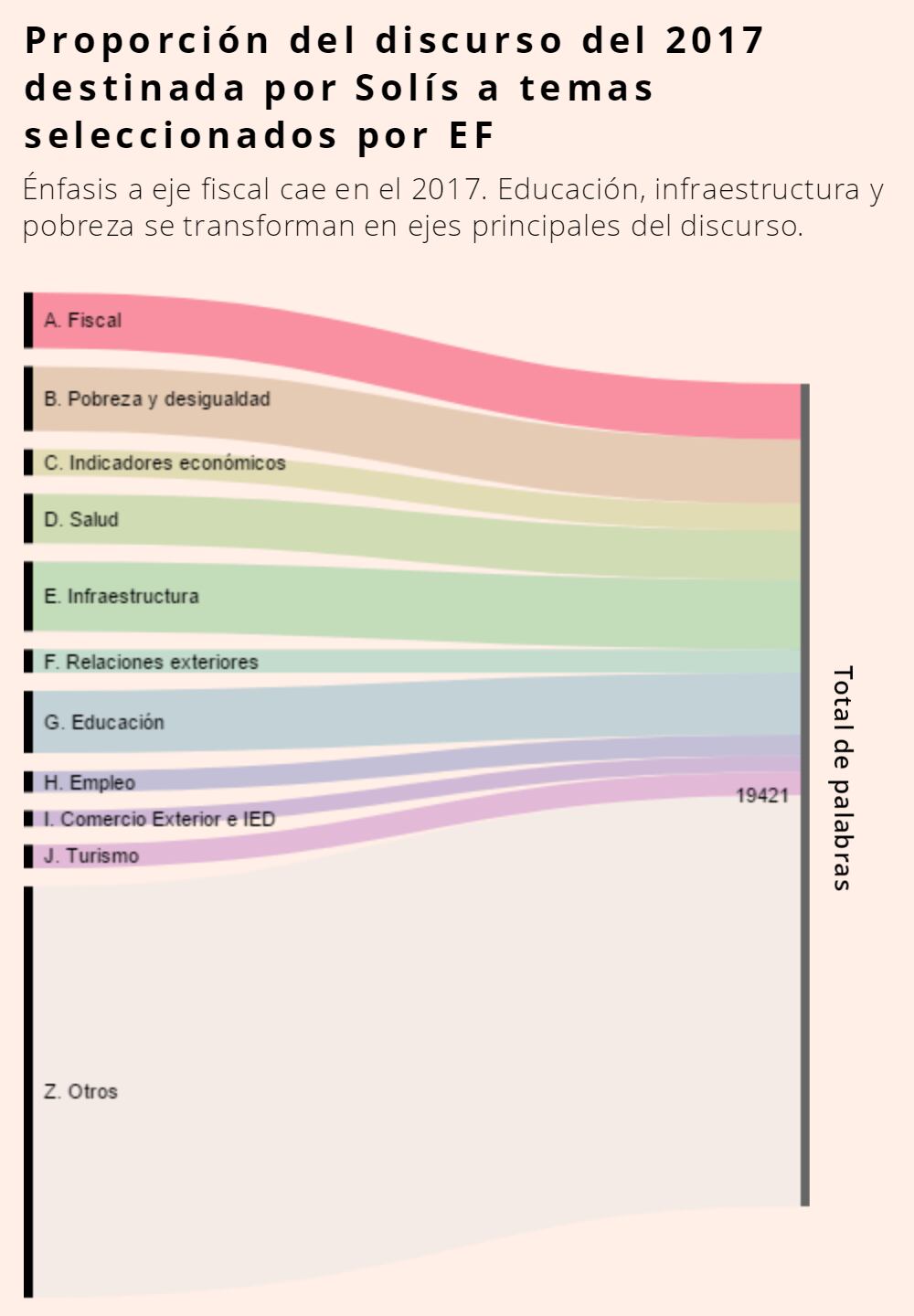 En el tema fiscal, el Presidente pasó de enunciar un 16% de sus palabras para ese eje en el 2016, a solo cerca de un 6% en su último informe del 2017. Otro temas tomaron más fuerza que el fiscal: al menos un 8% de sus palabras se dedicaron a infraestructura, un 7% a educación y otro 7% a la atención de los costarricenses en situación de pobreza y desigualdad.