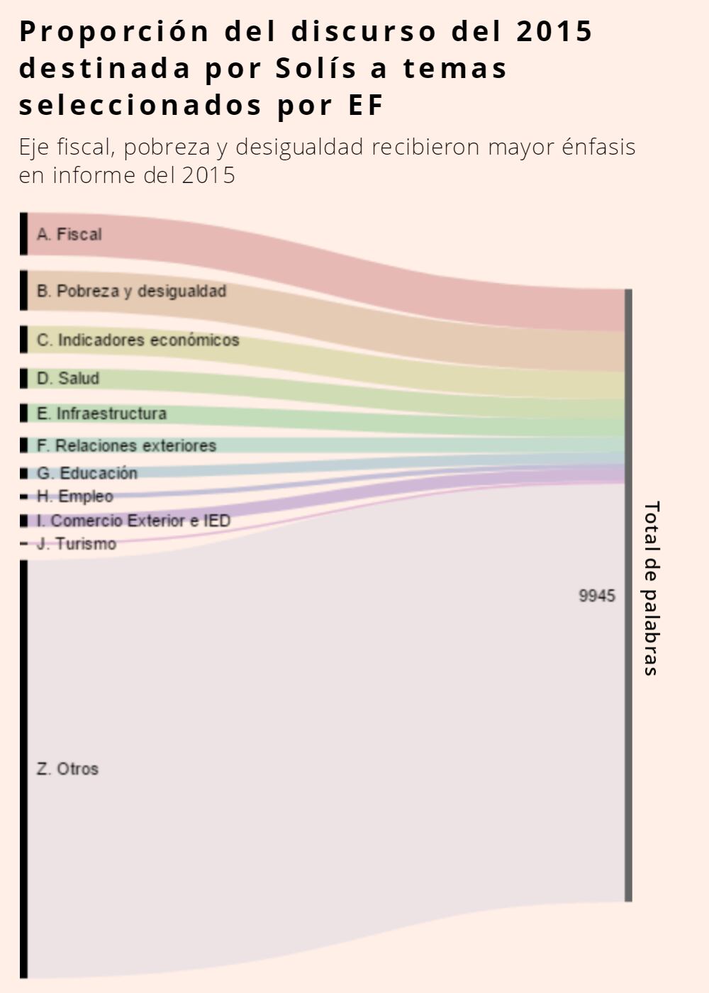 Así se desprende de un breve análisis realizado por El Financiero a los discursos del Informe del Estado de la Nación que ha enunciado Solís y a la proporción que brindó a diez tipos de ejes temáticos como parte del total del número de palabras del texto.