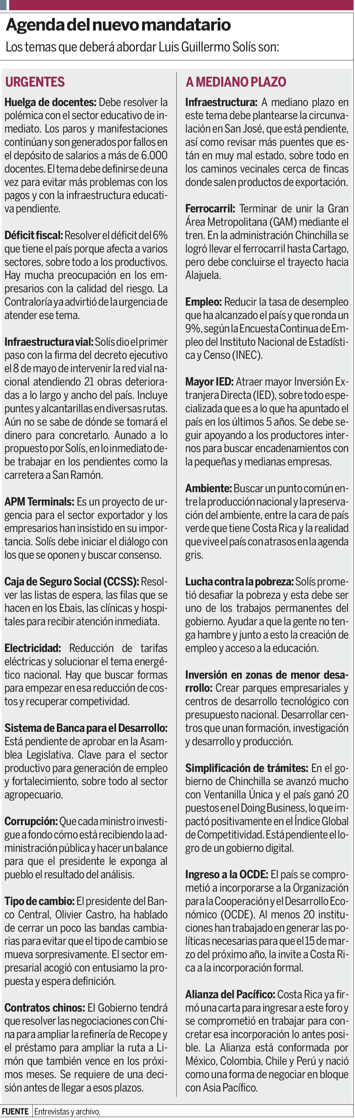 Por más que el presidente Luis Guillermo Solís quiera arrancar su administración con una agenda de largo plazo, está cercado por la herencia de al menos 10 temas de corto plazo que le heredó la expresidenta Laura Chinchilla y que está obligado a atender.