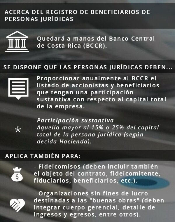 La disposición (que también aplica para fideicomisos y para organizaciones sin fines de lucro) permitirá al Instituto Costarricense sobre Drogas y al Ministerio de Hacienda tener acceso a información clave para prevenir el fraude fiscal, el lavado de dinero o el financiamiento del terrorismo.