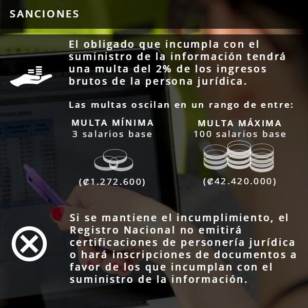 Si el contribuyente no entrega la información, podrá tener una sación equivalente al 2% de los ingresos brutos de la persona jurídica. La ley establece un rango de multa comprendido entre los tres y los cien salarios base.