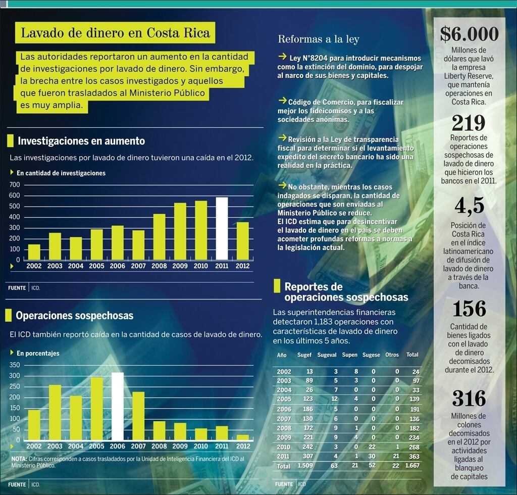 Según el ICD, en el 2012, del 100% de las condenas por violar la Ley N°8204 solo un 0,8% fue por el delito de legitimación de capitales. Adicionalmente, de las 349 investigaciones efectuadas por la Unidad de Inteligencia Financiera del ICD el año pasado, solo 34 fueron reportadas al Ministerio Público como operaciones sospechosas.