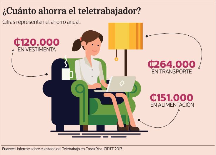 Una empresa se ahorra, en promedio, ¢270.000 anuales por cada persona que desempeña sus funciones desde su casa, de acuerdo con datos del Primer informe sobre el estado del teletrabajo en Costa Rica 2017, elaborado por el Centro Internacional para el Desarrollo del Teletrabajo (CIDTT).
