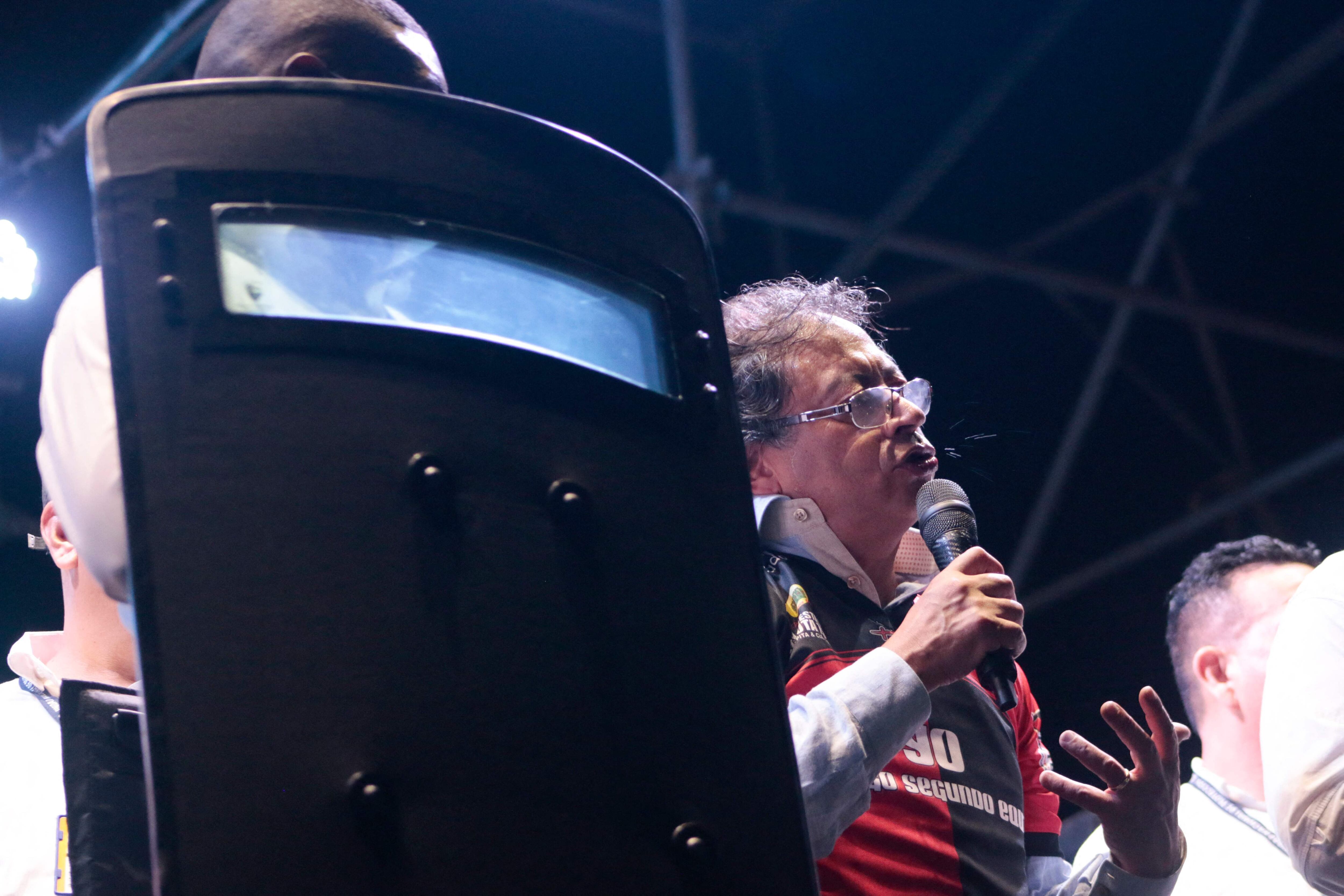 El miedo palpita en una plaza abarrotada de público. En la tarima, el candidato colombiano Gustavo Petro, con chaleco antibalas, rodeado de un ejército de escoltas que cruzan miradas nerviosas, apenas puede asomar la cabeza por entre tres escudos blindados.