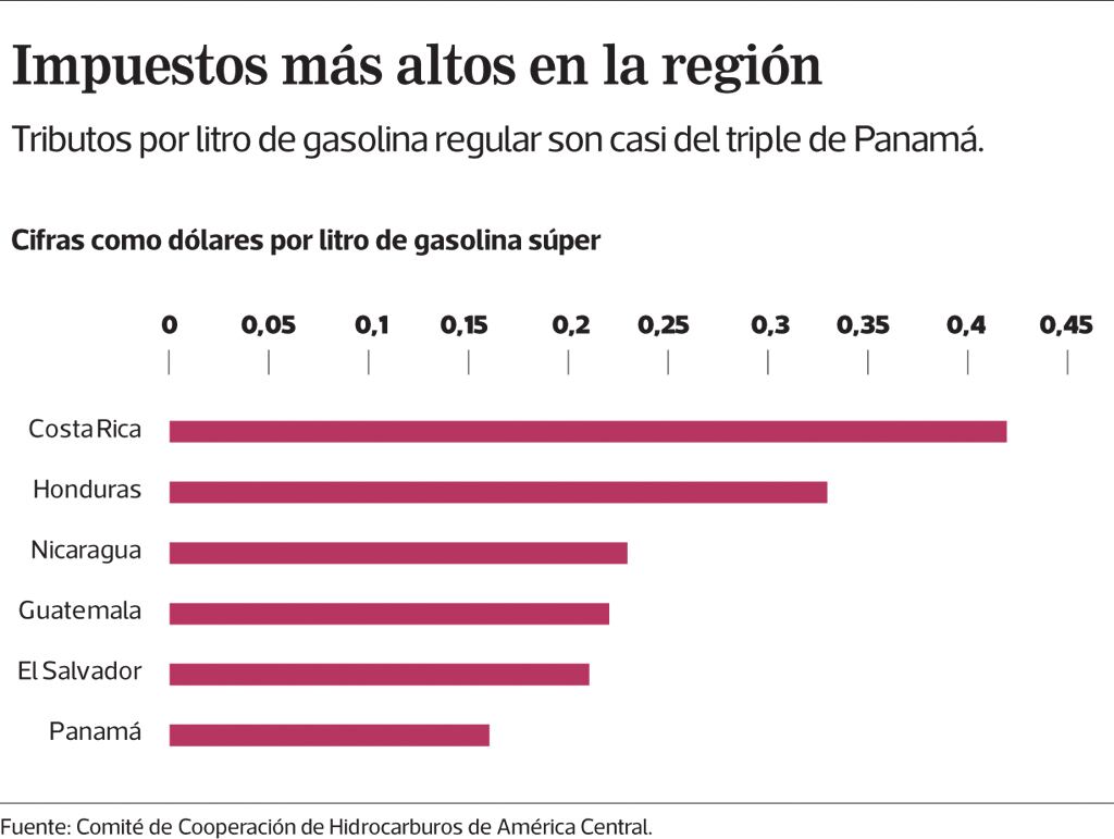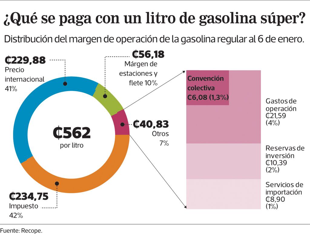De acuerdo con datos proporcionados por la entidad y actualizados al 6 de enero, la gran mayoría de lo que se paga por un litro de gasolina regular (¢465 de los ¢562 colones: un 83%) se dividen entre el pago del producto importado y el impuesto único a los hidrocarburos (destinado a Hacienda, la Red Vial Nacional, las Municipalidades y otras entidades).