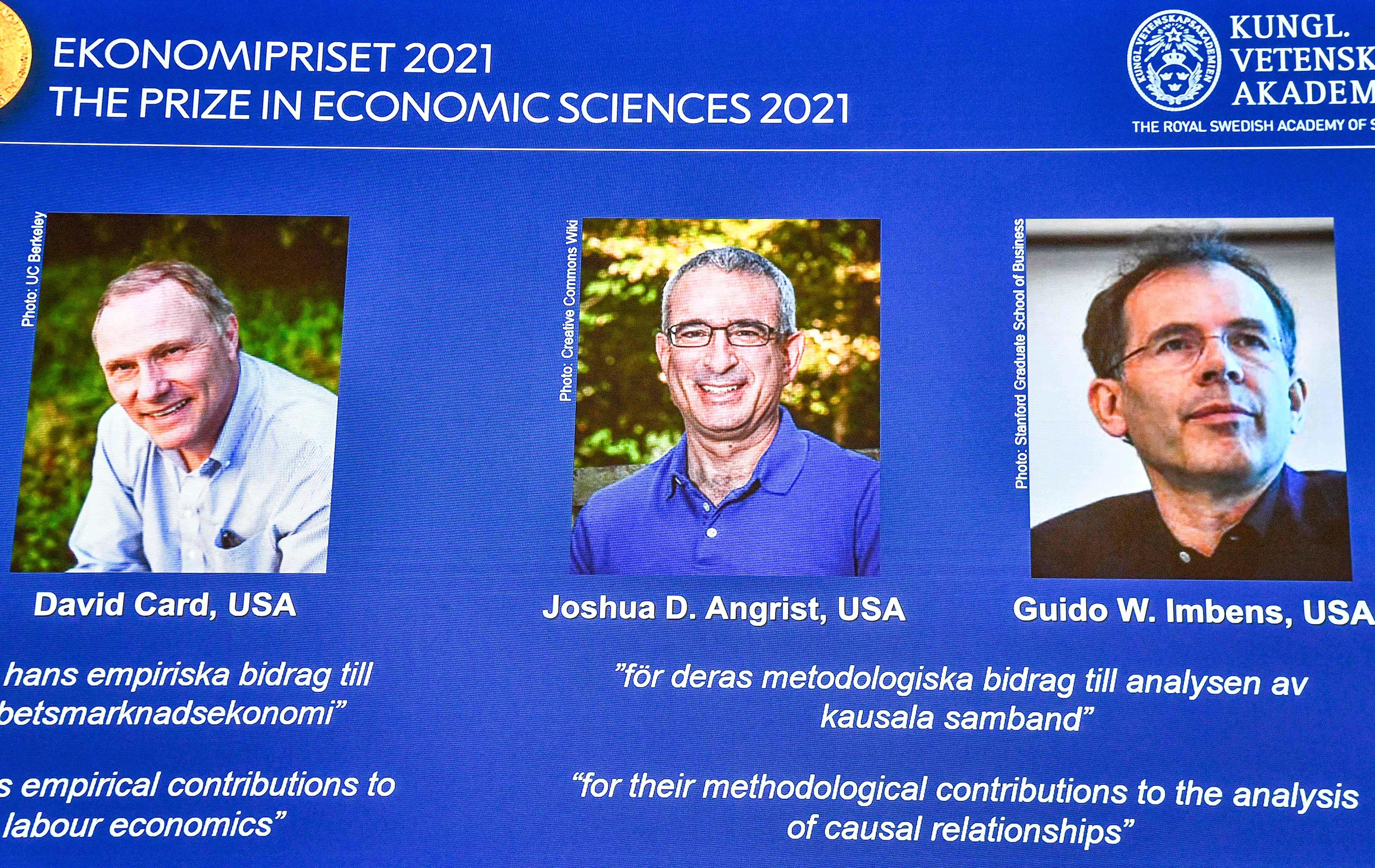 El estadounidense-canadiense David Card, el estadounidense-israelí Joshua Angrist y el estadounidense-holandés Guido Imbens aportaron "nuevas ideas sobre el mercado laboral" y mostraron "qué conclusiones se pueden sacar de experimentos naturales en términos de causas y consecuencias", explicó el comité Nobel en un comunicado.