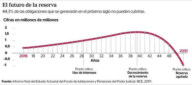 Según el IICE, el sistema comenzará a entrar en un primer punto crítico en el 2029, cuando deban empezar a disponerse de los intereses de las inversiones de reserva. La reserva se agotaría casi veinte años después, en el 2048.
