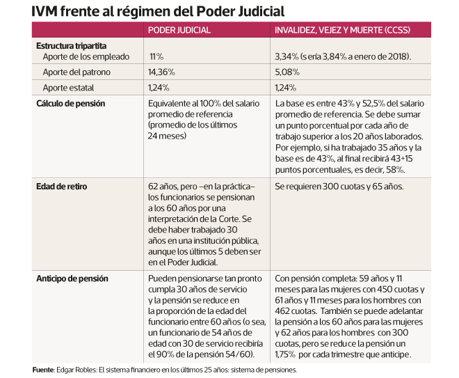 El aporte de los empleados del Poder Judicial es mayor al que hacen los trabajadores afiliados al IVM. Empero, en el sistema de pensiones de la Corte, el patrono –Poder Judicial– hace una contribución de casi el triple en comparación con el régimen de la CCSS.