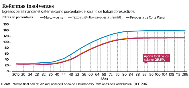Si se aprobara el proyecto planteado por la Corte sucedería algo similar. El régimen no podría cubrir un 35,3% de las obligaciones que se generarían y, en el próximo siglo, se acumularía un déficit de ¢3,88 billones.
