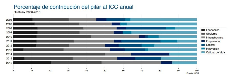 Estos tres cantones mejoraron su posición relativa, de la categoría muy baja a baja en el pilar económico, de igual manera Upala y Buenos Aires mejoraron en el Pilar clima laboral, pero Guatuso permaneció en las posiciones más bajas de este pilar.