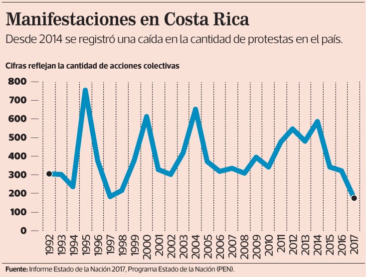 La buena relación entre los sindicatos y Solís le permitió al primer Gobierno del PAC construir un clima de paz social durante su gestión. Los datos del Informe Estado de la Nación 2017, evidenciaron una caída en la cantidad de protestas durante el periodo de 2014-2018.