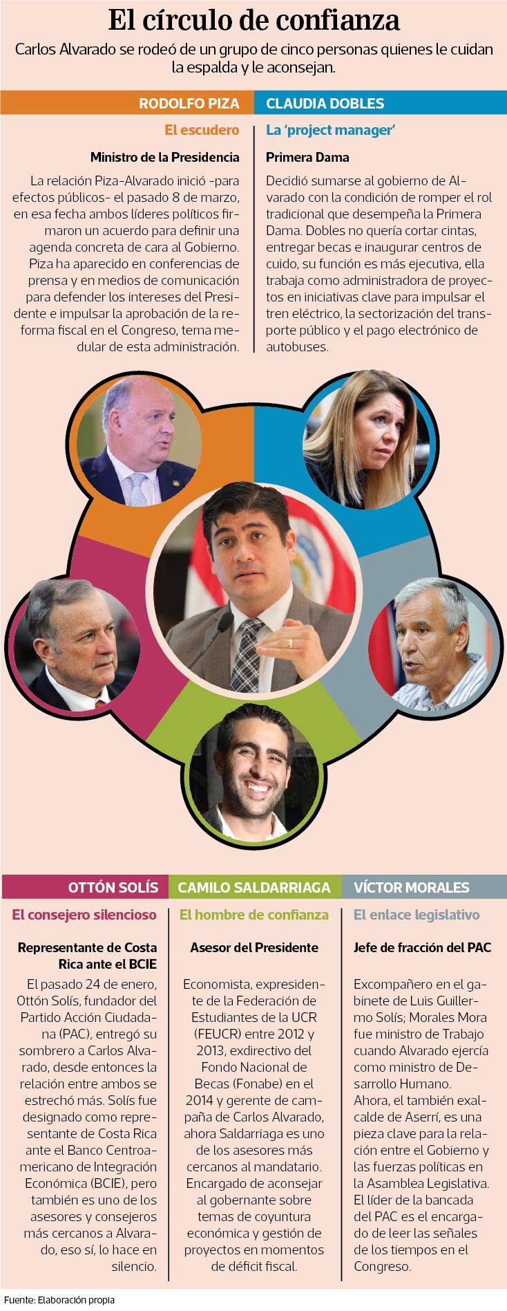 En el círculo más cercano al mandatario también se encuentran fichas de menor bagaje en las esferas políticas como la Primera DAma Claudia Dobles y el asesor Camilo Saldarriaga, exgerente de campaña de Alvarado.
