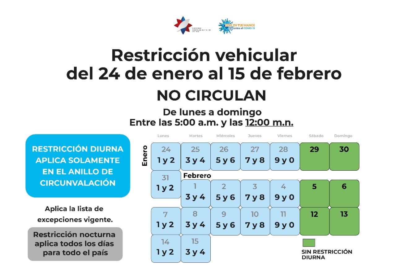 A partir del próximo lunes 24 de enero y hasta el 15 de febrero, la restricción vehicular sanitaria se reducirá dos horas y empezará a la media noche y hasta las 5:00 a.m., según comunicó este viernes el Gobierno de la República a través de un comunicado de prensa.