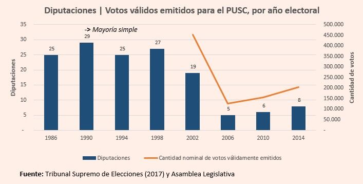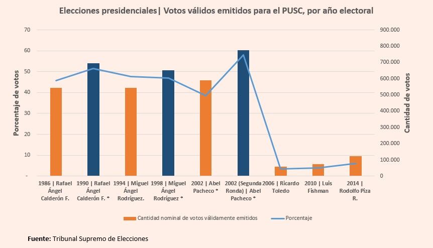 En las últimas tres contiendas presidenciales (2006, 2010 y 2014), por ejemplo, el apoyo al PUSC ha sido menor al 10%.
