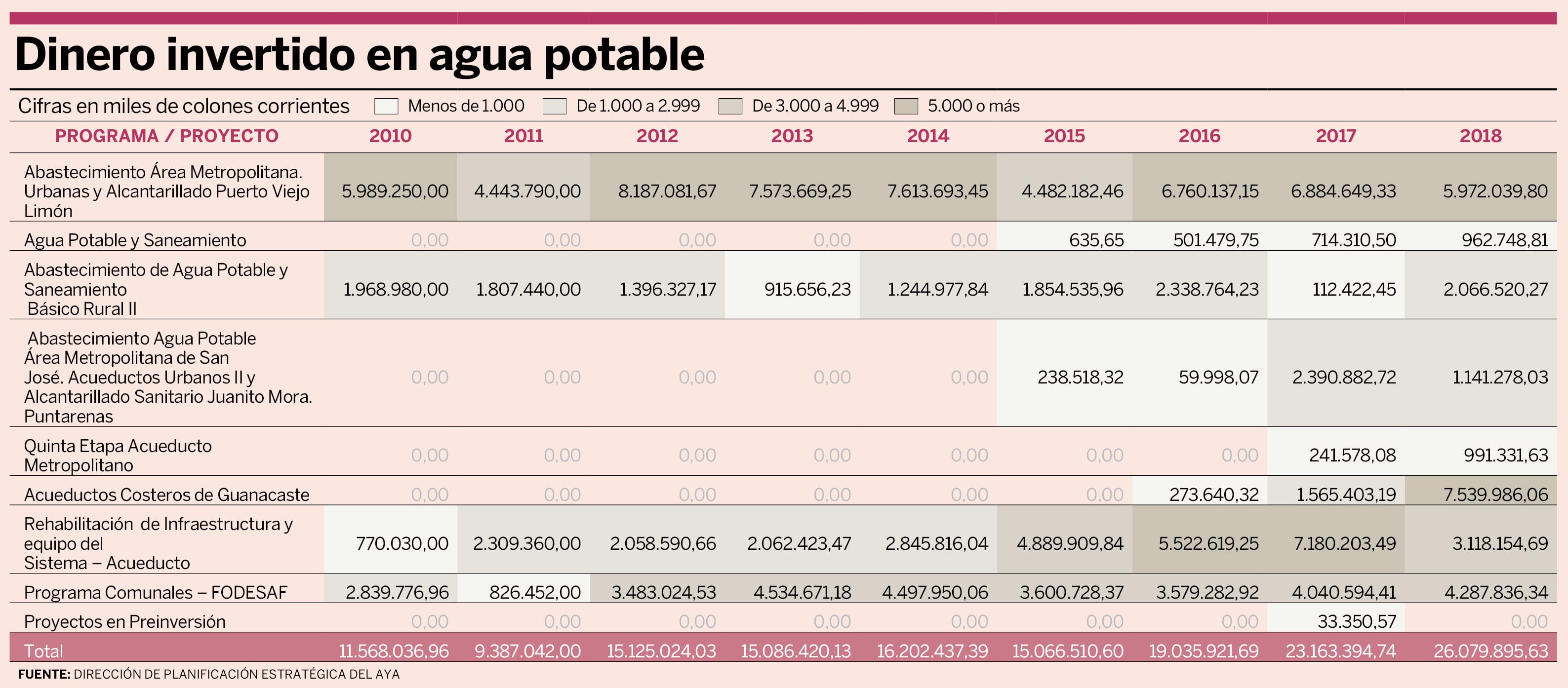La situación contrasta con las inversiones que ha realizado el país. Solo en el 2018 se destinaron ¢26.079 millones a proyectos de agua potable. La cifra revela un crecimiento del 13% si se compara con los ¢23.163 millones desembolsados en el 2017, según datos de la Dirección de Planificación Estratégica del Instituto Costarricense de Acueductos y Alcantarillados (AyA).