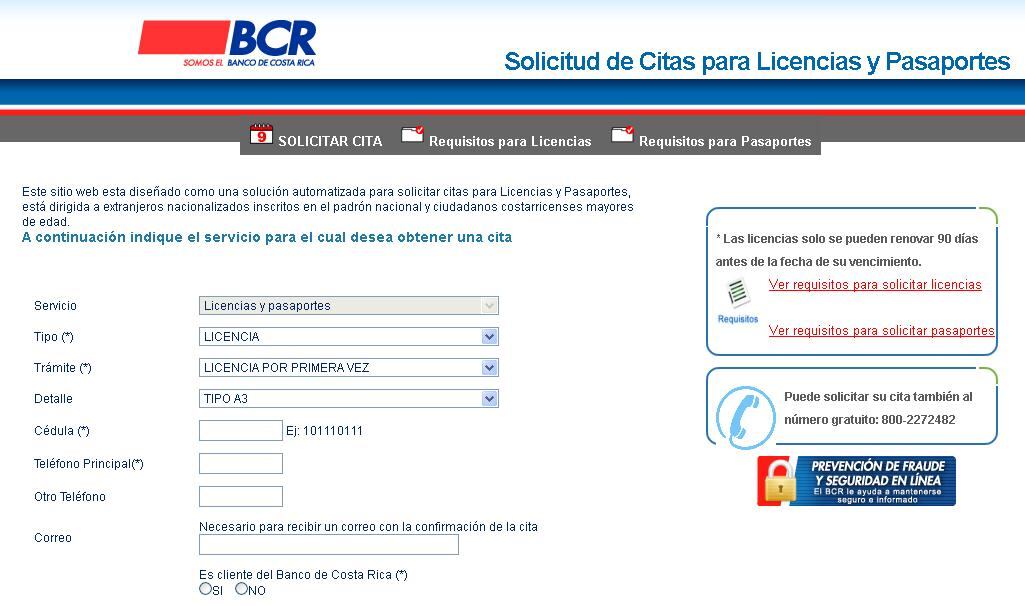El Banco de Costa Rica (BCR) habilitó en su página en internet una nueva solución que permite a los usuarios realizar los trámites de solicitud de citas para licencias y pasaportes por esta vía.