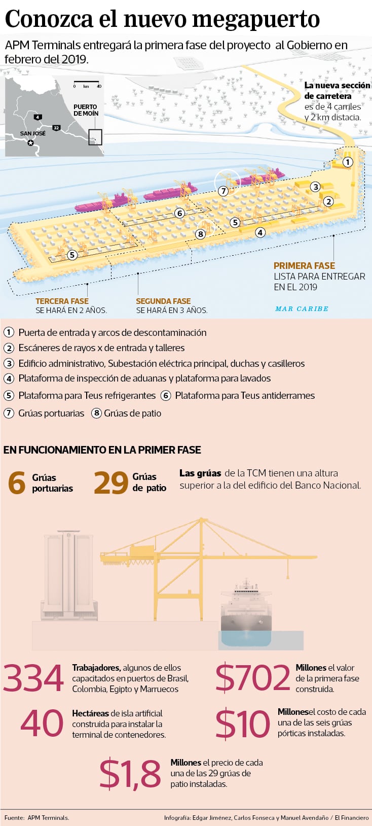 Una vez concluida la isla, se desarrolló la terminal de contenedores que en su primera etapa tendrá dos puestos de atraque, seis grúas pórticas -cada una de ellas más alta que el edificio del Banco Nacional en San José- y 29 grúas de patio para el movimiento interno de contendores.