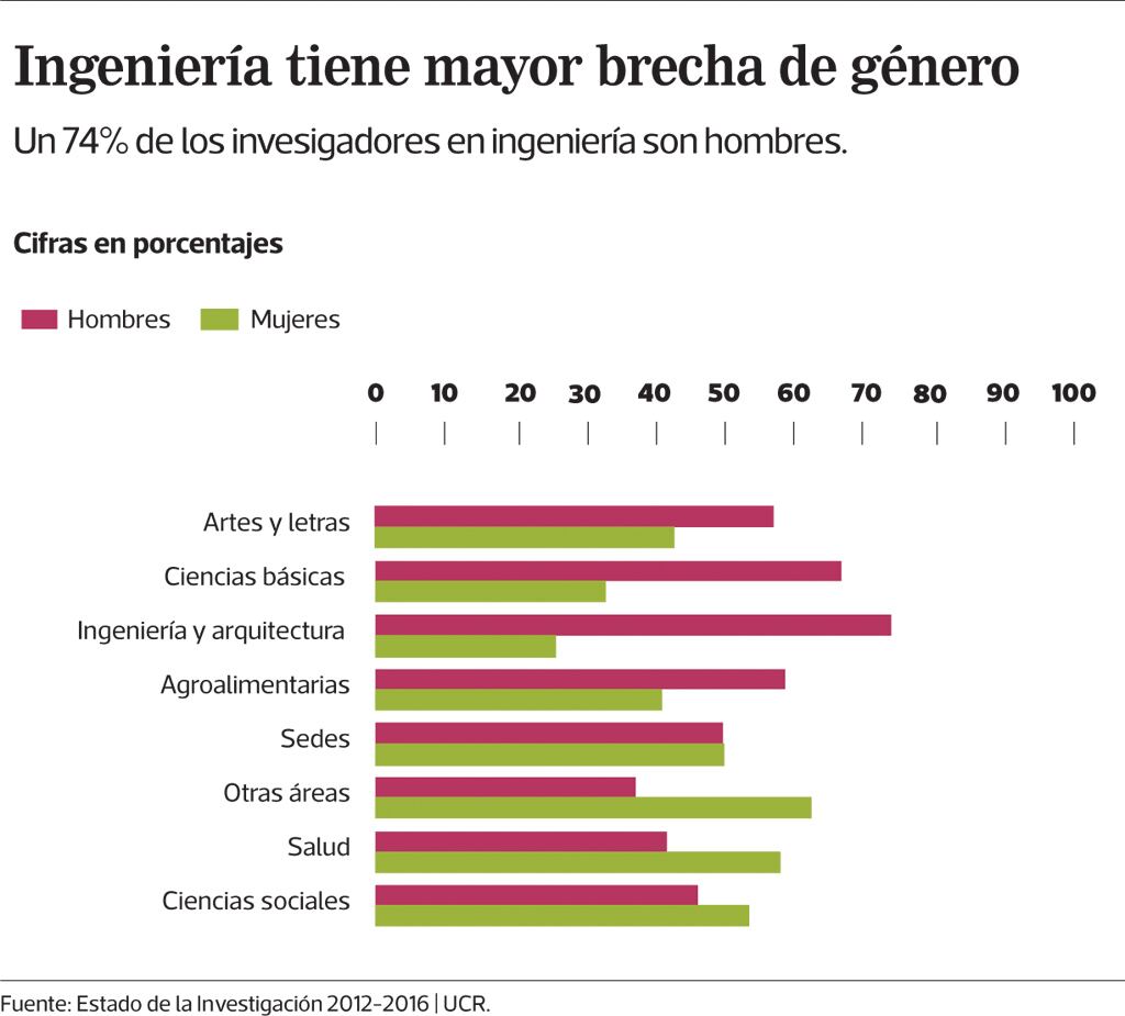 Al 2015 un 54% de los investigadores de la UCR eran hombres, pero el fenómeno de la brecha de género es especialmente amplio en áreas como ciencias básicas donde un 67% son hombres.