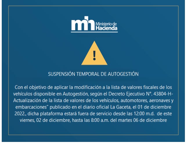 La plataforma consulta y pago del INS y la del Ministerio de Hacienda (sitio donde se revisa el valor fiscal del vehículo) se encuentran fuera de servicio debido a que el Gobierno está ajustando una nueva fórmula para reducir el costo del marchamo.