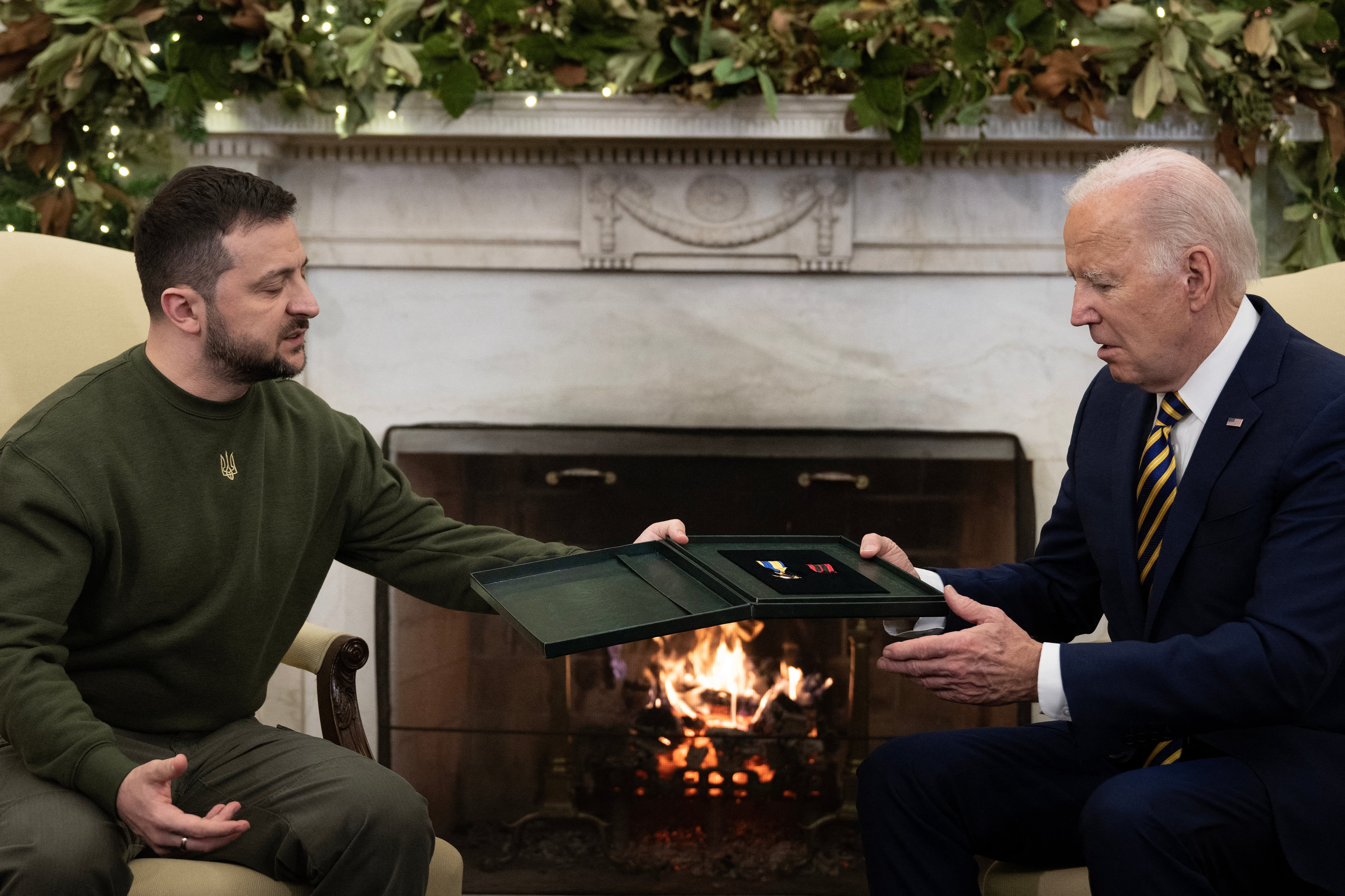 "Vamos a seguir reforzando la capacidad de Ucrania para defenderse, en particular la defensa aérea", dijo Biden a Zelensky sentados junto a la chimenea del Salón Oval.