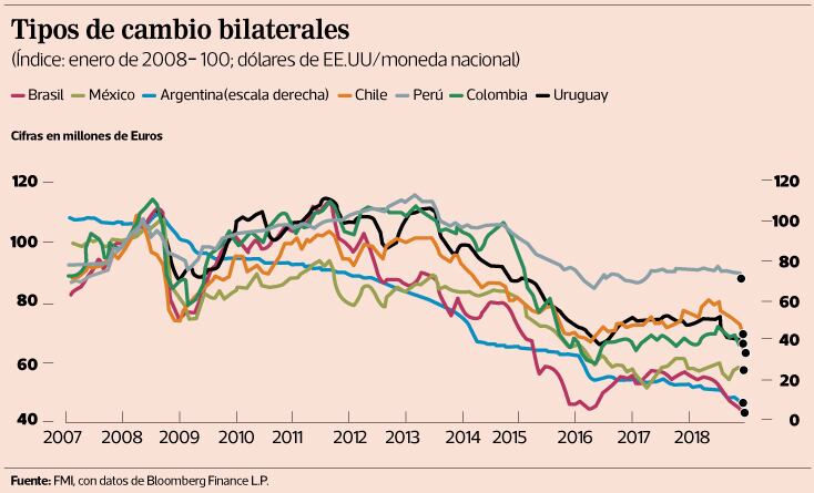 Las principales monedas latinoamericanas registran fuertes caídas y este es uno de los riesgos, junto con el alto nivel de endeudamiento, que enfrentan estas economías para mejorar sus resultados, según destacó el Fondo Monetario Internacional (FMI) en sus perspectivas económicas para el periodo 2018-2019.