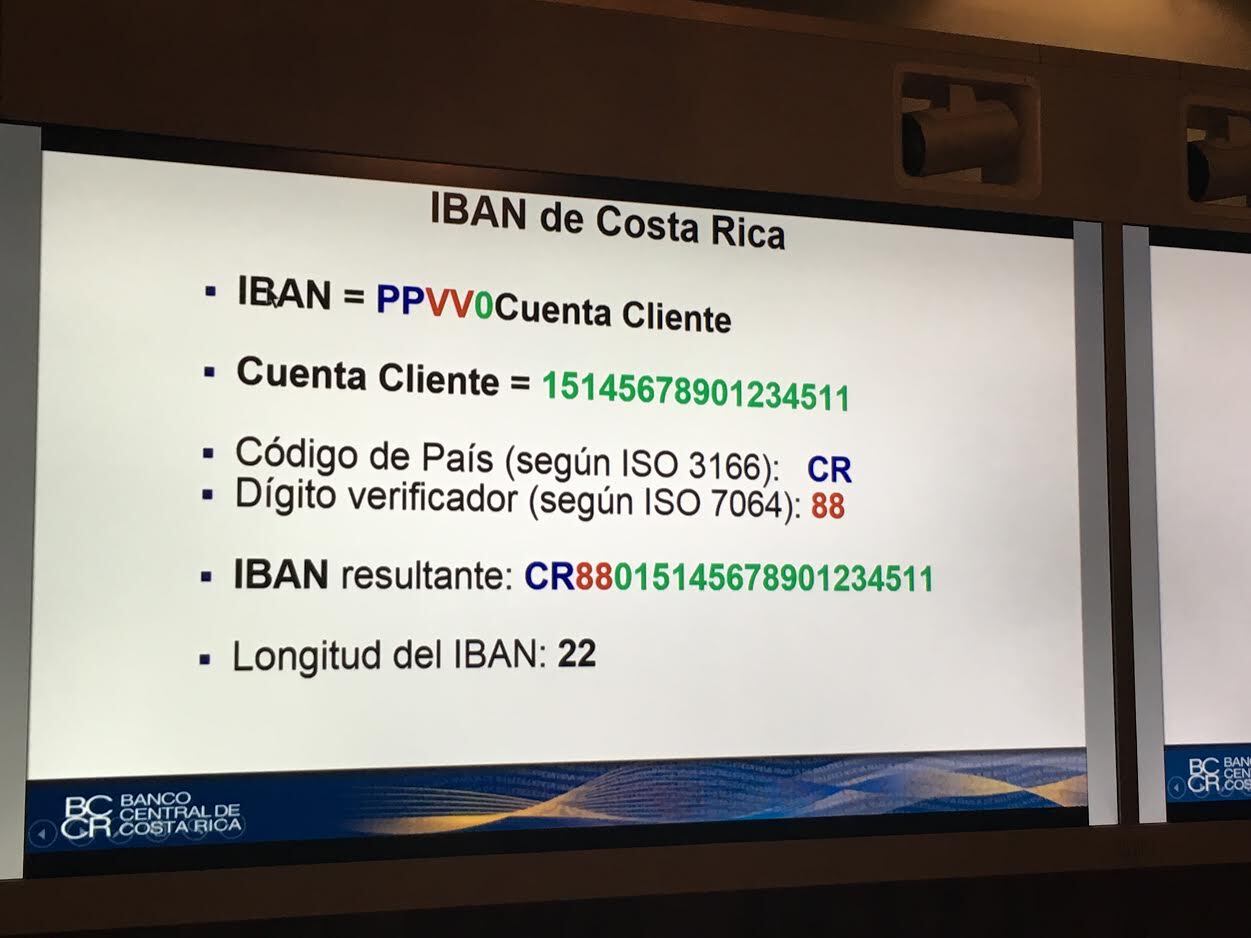 El IBAN estará compuesto en Costa Rica por 22 dígitos: los primeros dos son el código del país, le siguen dos más como número verificador, un cero y los restantes 17 dígitos son el número de cuenta cliente.