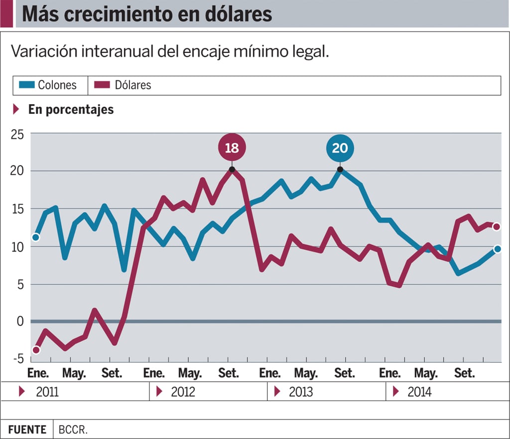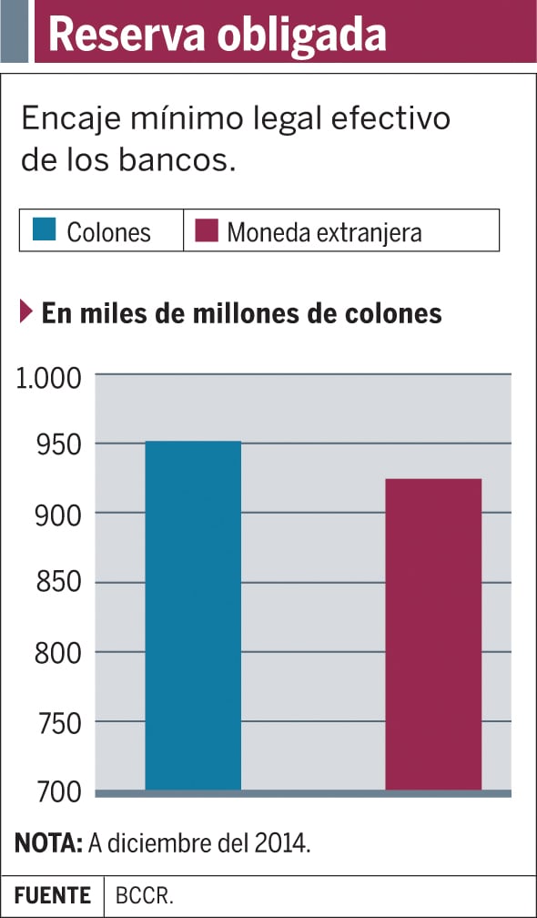 A diciembre del 2014 el Central sumó en encaje mínimo legal en moneda nacional ¢950.721 millones y el equivalente a ¢924.455 millones en dólares.