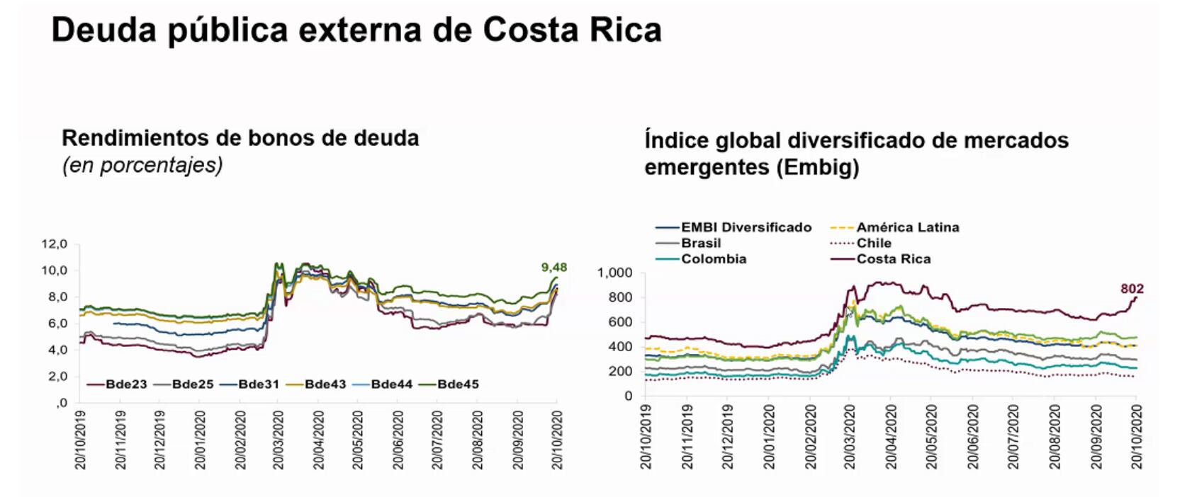 El Banco Central de Costa Rica (BCCR) proyectó que en 2020 la contracción será del 4,5% del PIB en lugar del 5% estimado en julio, pese a que es posible observar una leve recuperación la entidad insiste que el shock de la pandemia agravó la situación fiscal, la cual es el principal obstáculo en el camino a la recuperación.