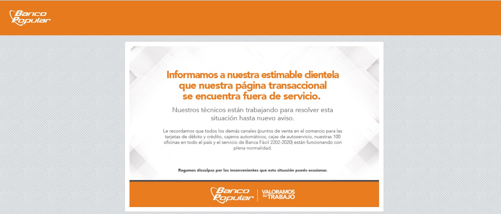Pero, aclaró que los demás canales funcionan con normalidad, a saber: puntos de venta en el comercio para las tarjetas de débito y crédito, cajeros automáricos, cajas de autoservicio, las oficinas y el servicio Banca Fácil.