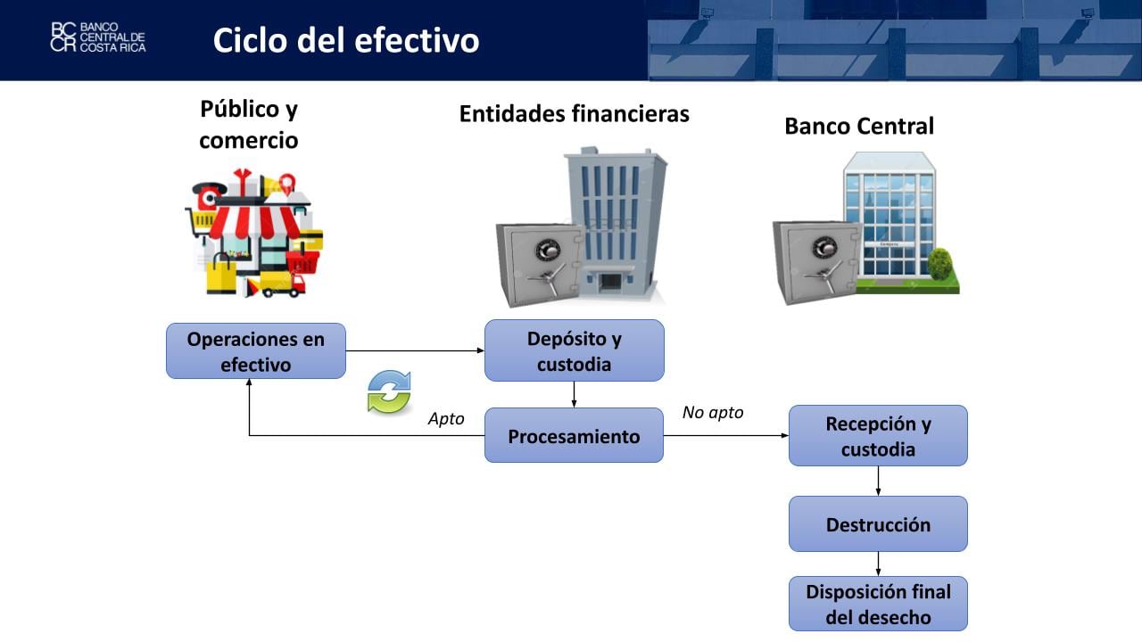 Las entidades financieras reciben los billetes que el cliente desee cambiar o depositar porque ya salieron de circulación. Desde ese momento los almacenan para entregar en fechas determinadas al BCCR.