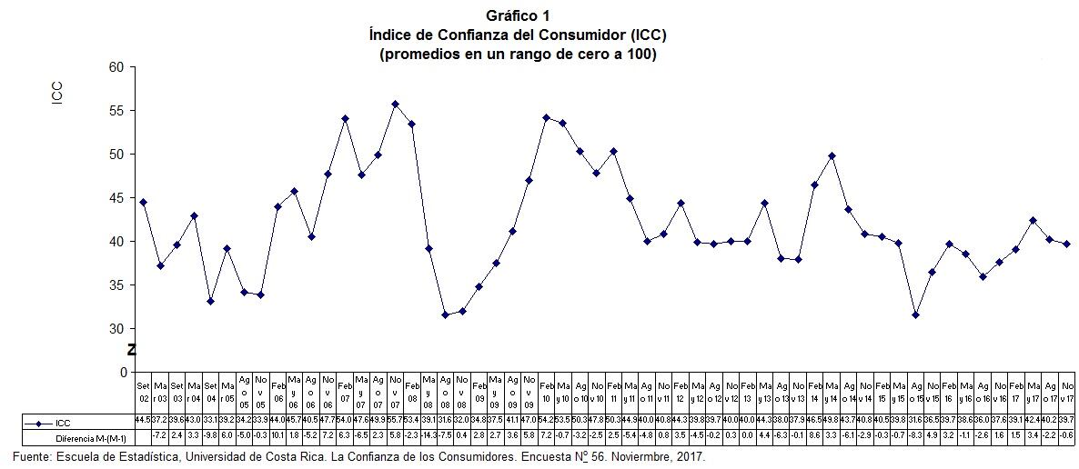 El Índice de Confianza del Consumidor (ICC), medido por la UCR, cerró el 2017 a la baja y el dato de noviembre cerró en 39,7 puntos (0,6 puntos menos que en agosto), en una escala de 0 a 100.