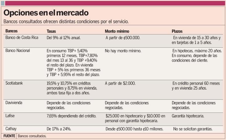 En algunas, entidades, como en el Banco Nacional, van desde el 7,65% los primeros dos años hasta otras instituciones financieras que cobran 5% los primeros 36 meses y luego Tasa Básica Pasiva (TBP) más 5,95 puntos porcentuales el resto del plazo acordado para la cancelación del crédito.