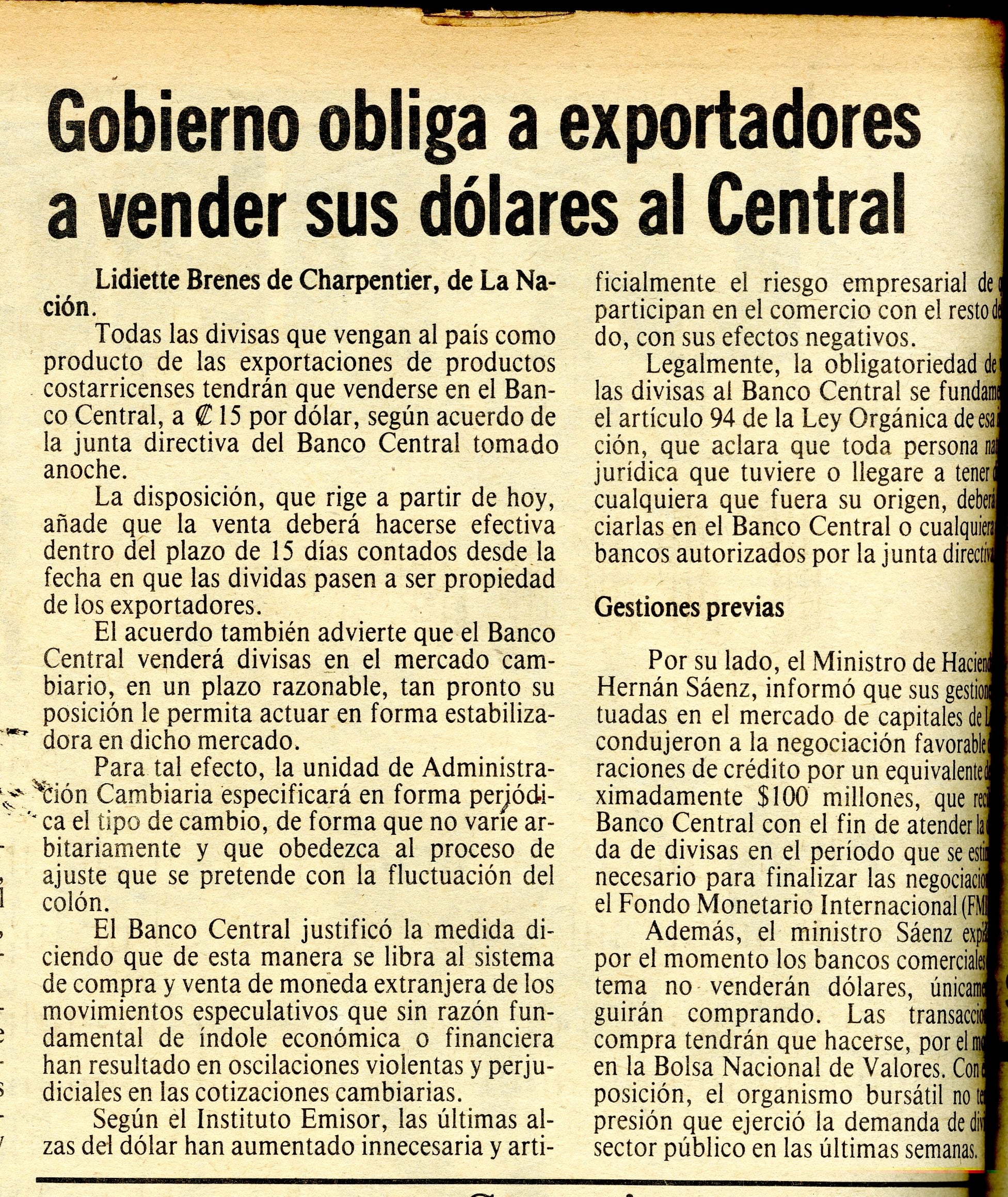 La escasez, sin embargo, continuó, y en marzo del 81 el Banco Central obligó a todos los exportadores a liquidar el 100% de las divisas que obtuvieran por vender sus productos fuera de Costa Rica en un plazo máximo de 15 días después de adquirirlas. Empero, las ventas se harían a un tipo de cambio establecido por el Central, el cual solía ser menor al que había en el mercado libre.