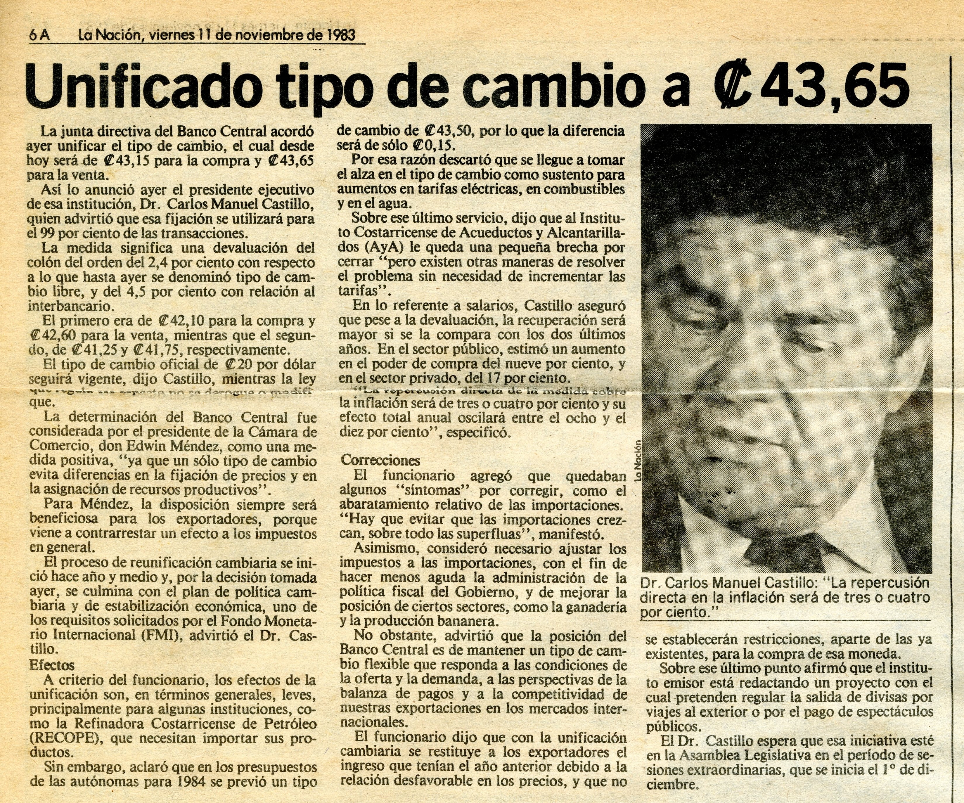 Entre esas acciones estaba el abandono de un tipo de cambio fijo por uno fluctuante. Ahora, todos los costarricenses, incluidos los exportadores e importadores, debían adquirir los dólares a precios del mercado libre, donde las fuerzas de oferta y demanda determinarían la cotización del dólar.