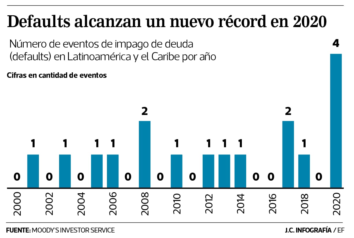 Analistas de deuda soberana de Moody’s explicaron en un informe sobre perspectivas económicas para la región que la compleja situación financiera, el aumento sustancial de la deuda y las presiones sociales amplificadas por el impacto de la crisis del coronavirus, culminaron un número récord de defaults soberanos, es decir, impagos de deuda sobre bonos soberanos en la región.