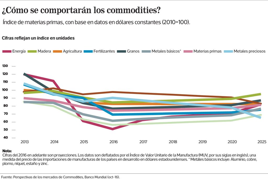 Los precios de la energía, encabezada por el petróleo, así como los metales y los minerales serían los commodities que más se alejarían de lo visto en 2016.