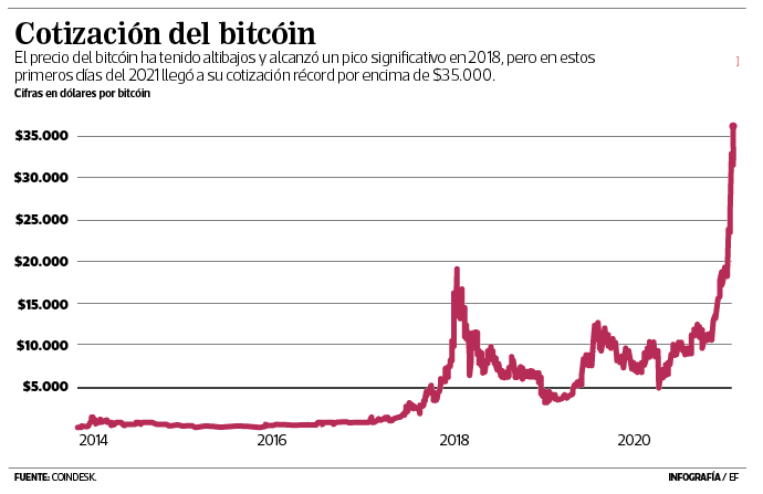 Durante la primera semana del año, el valor del bitcoin superó los $40.000 por unidad, el precio más alto de su historia, luego de un diciembre de subida donde llegó hasta los $20.000.