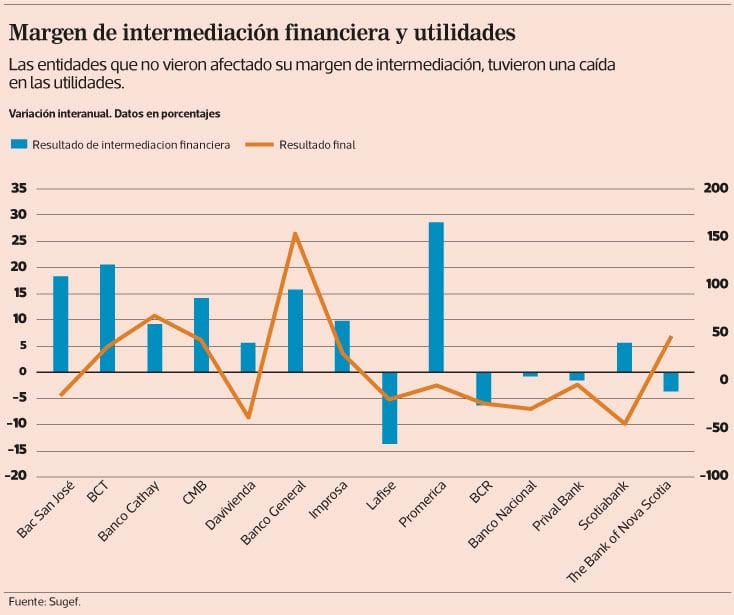 Entre los bancos privados la situación fue la siguiente: de las 12 entidades reguladas por Sugef, 8 tuvieron reducciones en el margen financiero y 7 sufrieron caídas en sus utilidades, especialmente los más pequeños.