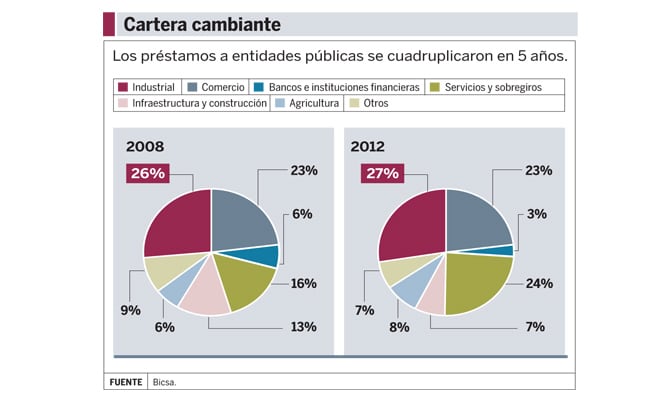 El mayor incremento se registró en el financiamiento a instituciones públicas que se cuadruplicó, al pasar de $10 millones en 2008 a $44 en el 2012. Sin embargo, solo representan un 4% del total de colocaciones crediticias.